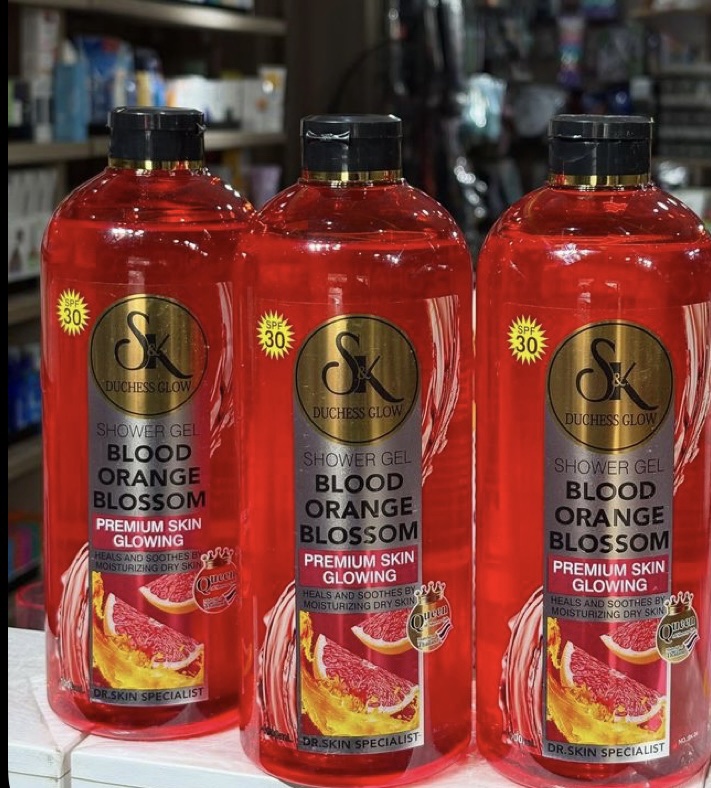 Dr. Skin Specialist Duchess Glow Shower Gel Blood Orange Premium Skin Glowing, each 300ml, lined up on a store shelf. They feature orange accents, grapefruit illustrations, and labels promising premium skin glow with real and soothing extracts—vibrant and luxurious