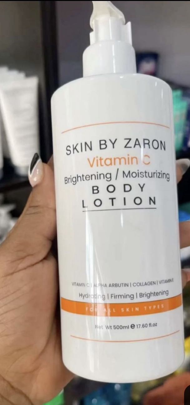Skin By Zaron Vitamin C Brightening/Moisturizing Body Lotion (500ml) hydrates and firms skin while brightening complexion. It contains Vitamin C, Alpha Arbutin, Collagen, and Vitamin E to nourish, lighten dark spots, and improve skin elasticity. Suitable for all skin types, it’s great for daily use to achieve radiant, smooth, and moisturized skin.